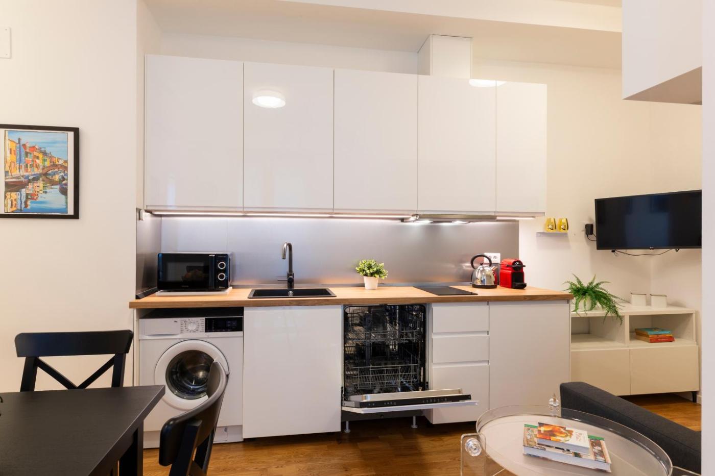 Appartamento con 1 Camera da Letto. This apartment comprises 1 living room, 1 separate bedroom and 1 bathroom with a shower and free toiletries. The well-equipped kitchenette has a stovetop, a refrigerator, a dishwasher and kitchenware. This apartment is air-conditioned and features a seating area with a flat-screen TV, a washing machine, a coffee machine, a dining area, as well as a wardrobe. The unit offers 2 beds.